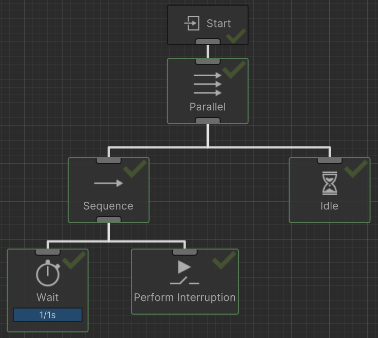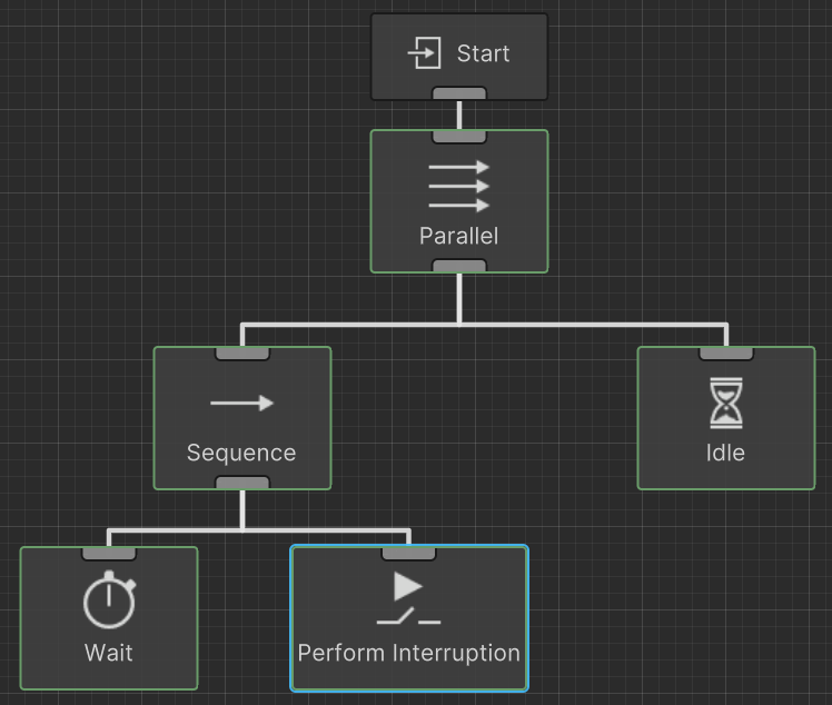 The Perform Interruption task will immediately stop the specified tasks from running and will return success or failure depending on the value of interrupt success. Comparing to conditional aborts, this task can be used when you want to have more control over when a branch aborts. The most common use case will be paired with the Parallel task which interrupts the specified task: