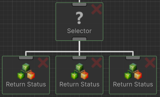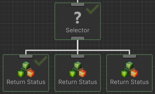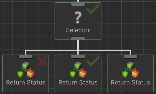 In this example the first Return Status task returned failure. Because of the failure the Selector moved onto the next child, which returned success. Because a child returned success the Selector stopped traversing and returned a status of success.