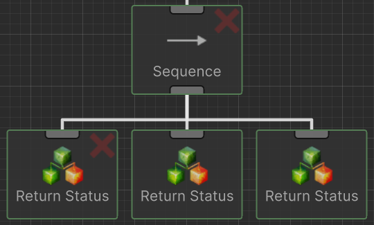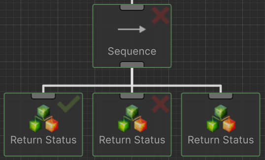 In this example the Return Status task first returned success. Because of the success the Sequence task moved onto its next child, the middle Return Status task. This task returned failure and the Sequence task stopped traversing and returned a status of failure.