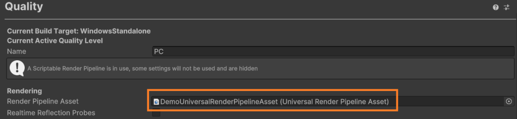 4. The DemoUniversalRenderPipelineAsset is set within the Graphics Project Settings or Quality Project Settings:Graphics Settings (Pre-Unity 6):