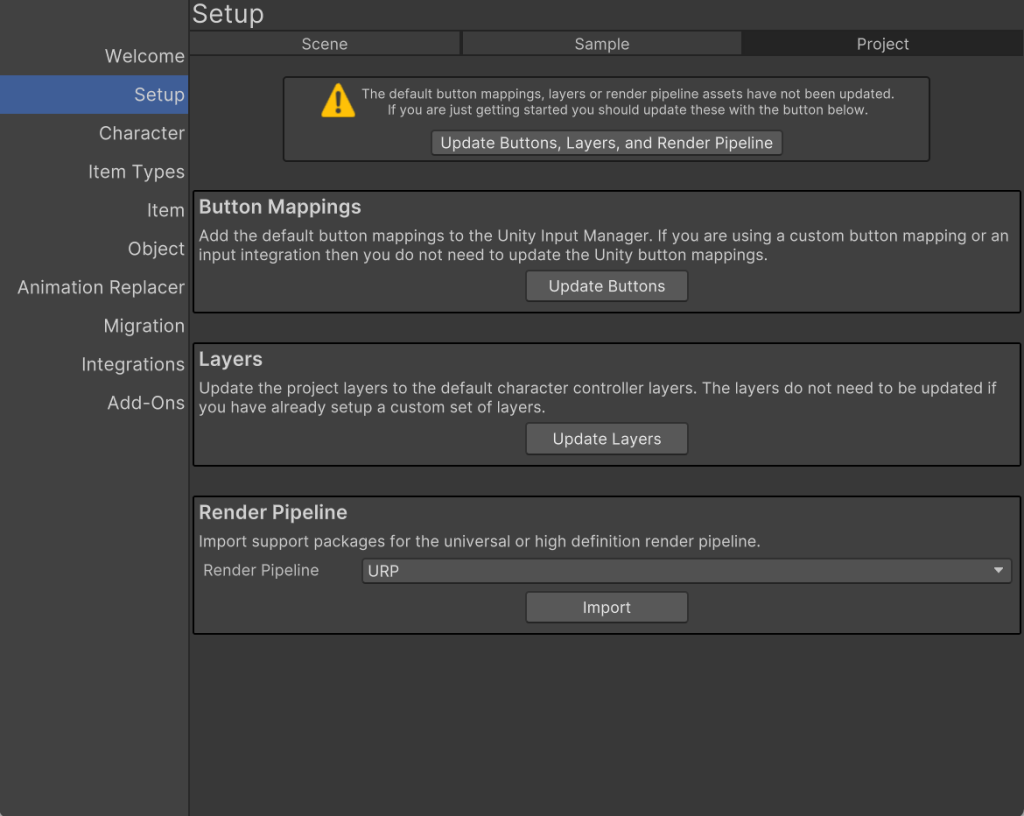 If you are just getting started you should select the Update Buttons, Layers and Render Pipeline button. This will add the default button mappings, layer settings, and import the active render pipeline.