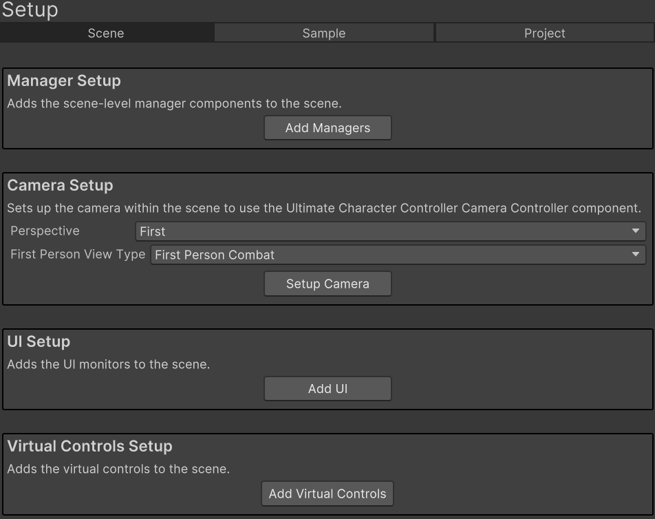 Before you create your character the scene needs to first be setup to work with the Ultimate Character Controller. Setting up the scene involves adding the scene-level manager components and adding the Camera Controller. The scene-level manager components include objects such as the Object Pool and Surface Manager which are a singleton component necessary for the Ultimate Character Controller to function. These objects can easily be created within the Setup Manager (Tools -> Ultimate Character Controller -> Main Manager, then select Setup):
